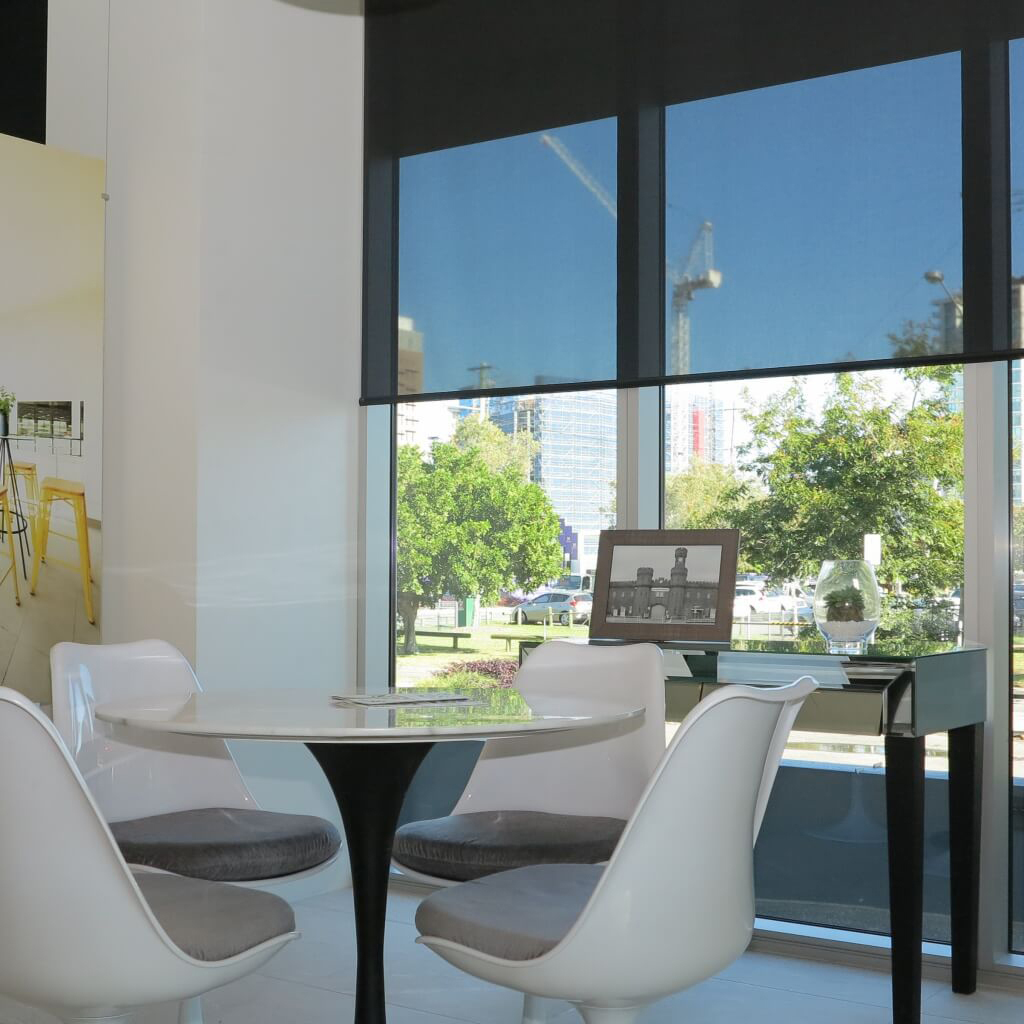 The Viewscreen roller blind is a transparent fabric option for roller blinds allowing warm natural light to enter your apartment. Unlike a light filter fabric, choosing Viewscreen ensures you won’t loose your view. The modern roller blind is a minimalist window furnishing that becomes architecturally part of your office or apartment. When lowered roller blinds are visually consistent. When rolled up they allow the outside world engulf your room and the roller blinds are barely noticeable. Protecting your buildings warranty, our roller blinds are mounted to the apartment ceiling or office ceiling grid.